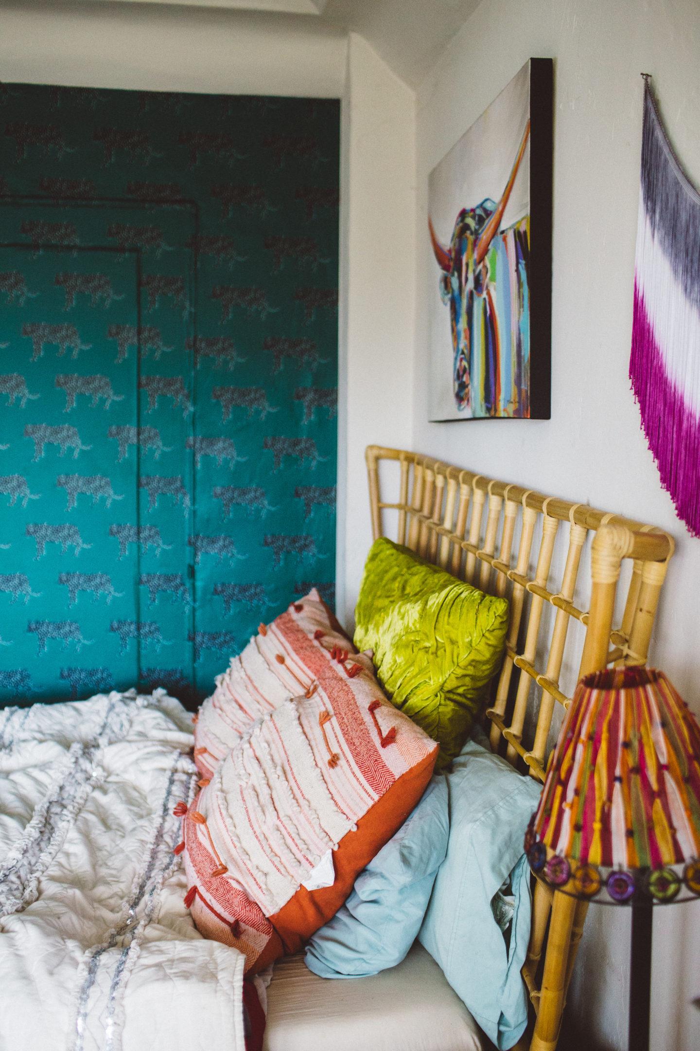 A really easy and affordable way to add tropical home decor is by swapping out your throw pillows on your couch or bed. Add palm printed pillows or pillows with pom-poms for cute tropical bedroom decor vibes!