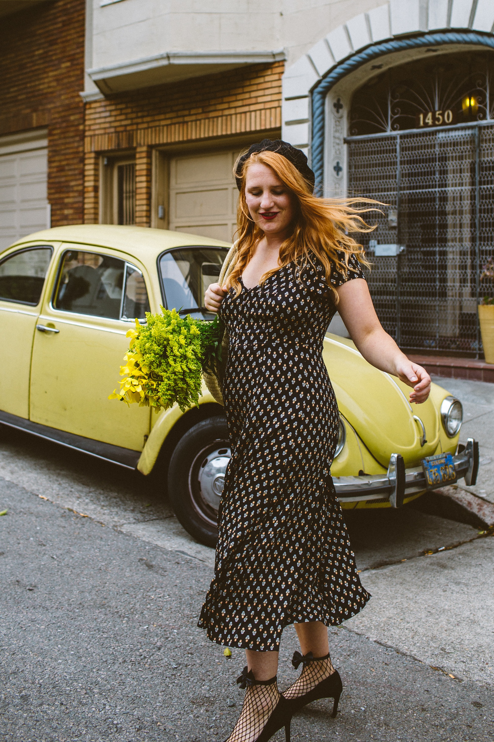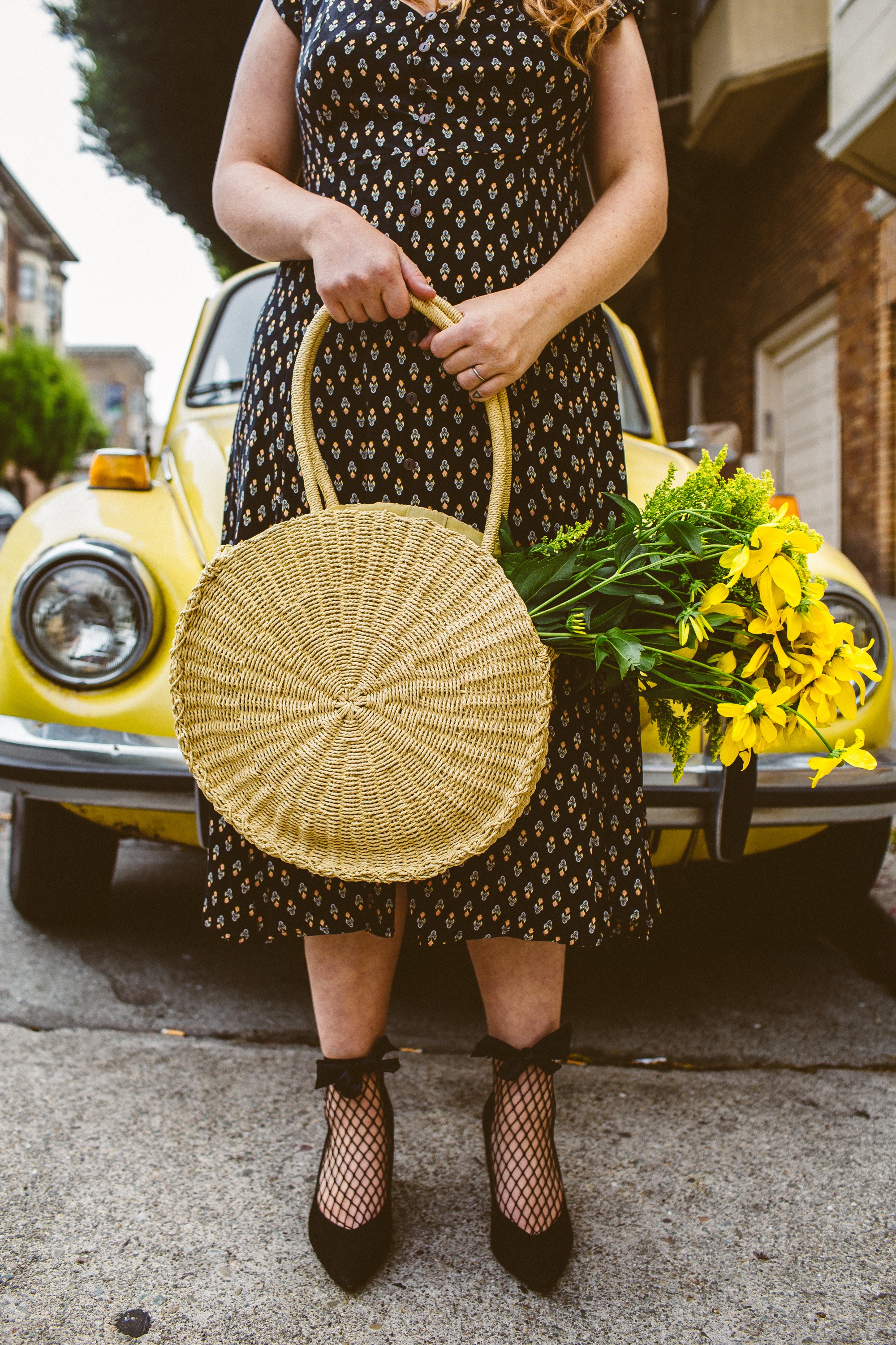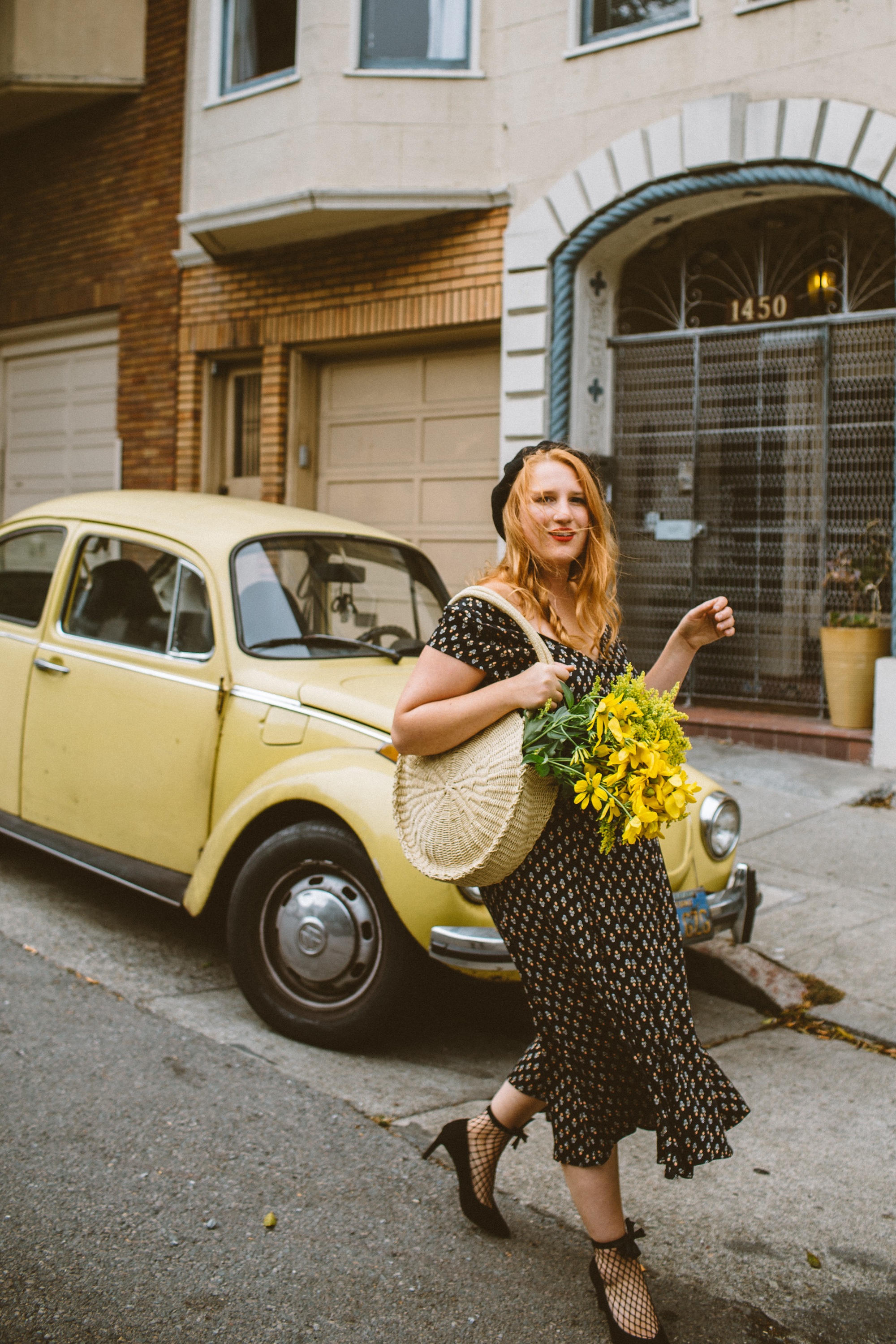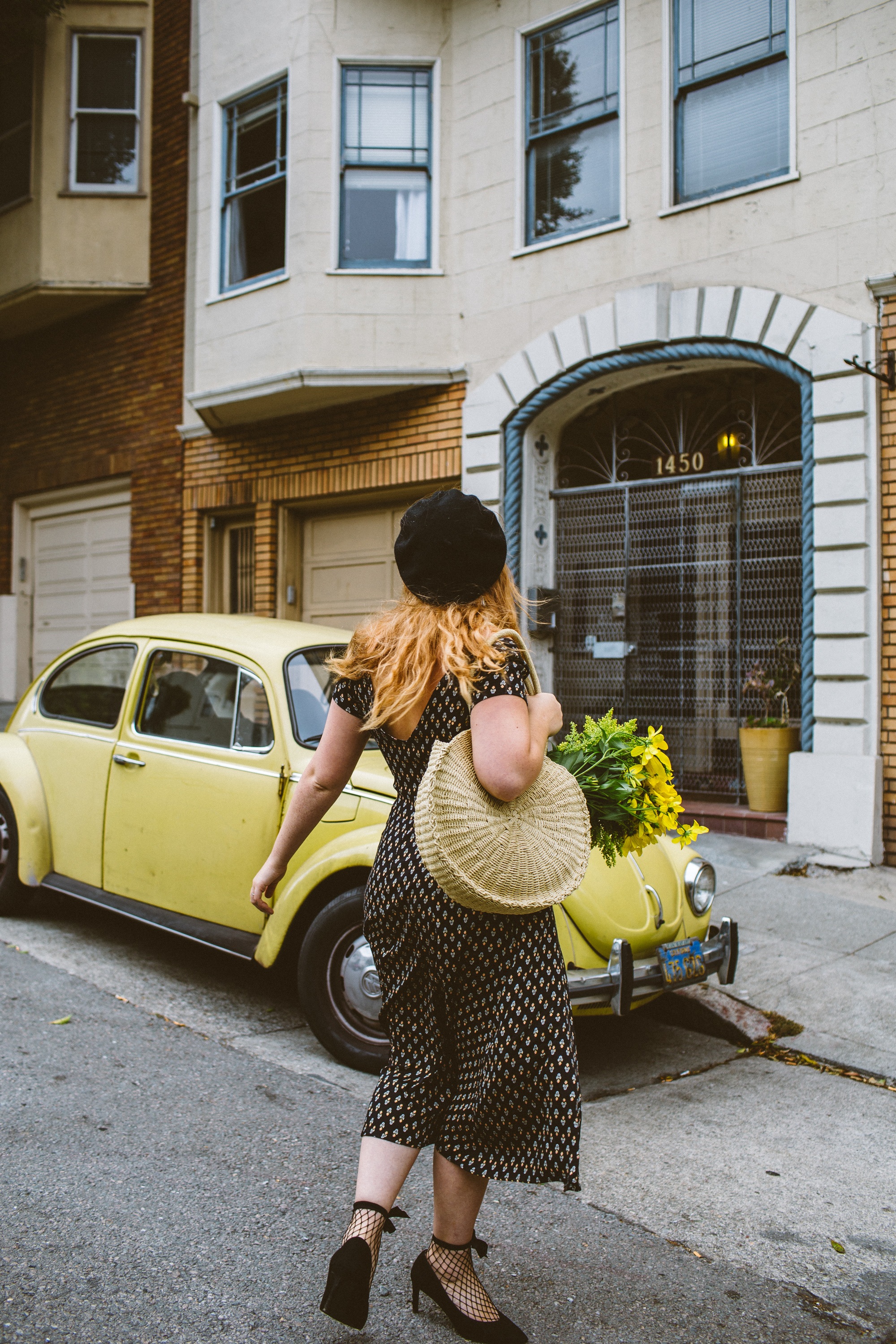 This floral midi dress from Urban Outfitters is incredibly soft, which surprised me. I love the pattern, which leans towards fall color schemes, still works for all seasons. Here, I paired the dress with my favorite fish net socks and heels for a feminine touch. I’ve been obsessed with straw purses lately. This bag is also from Urban Outfitters and would make such a great vacation or farmers market purse as it’s big enough to tuck chunky items in it. Topped it off with a beret for a little French flair!
