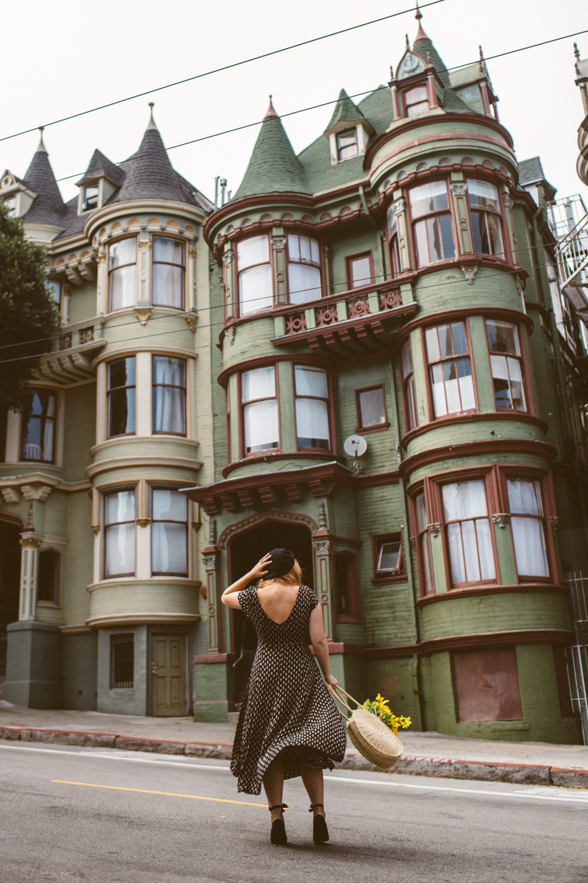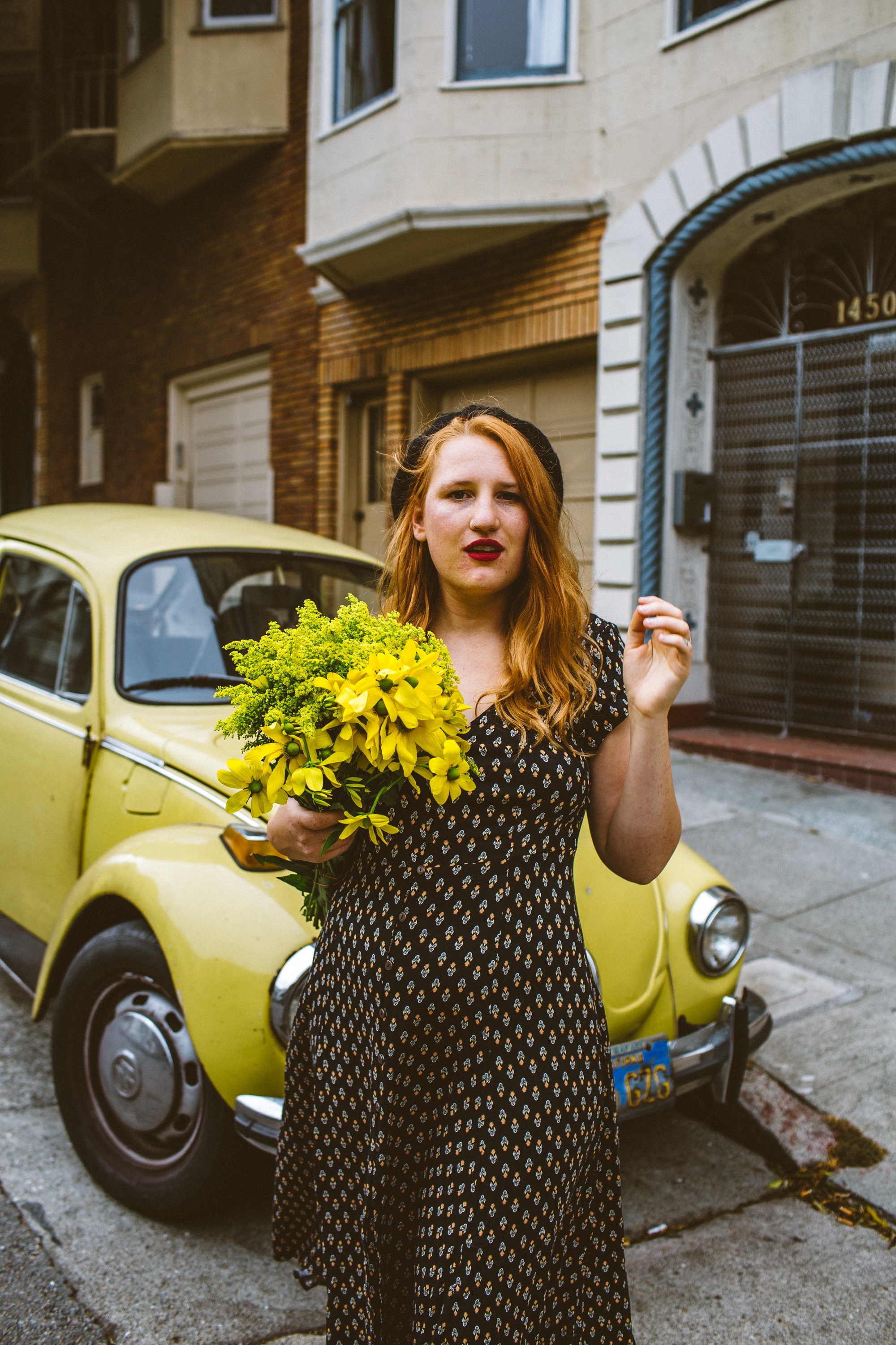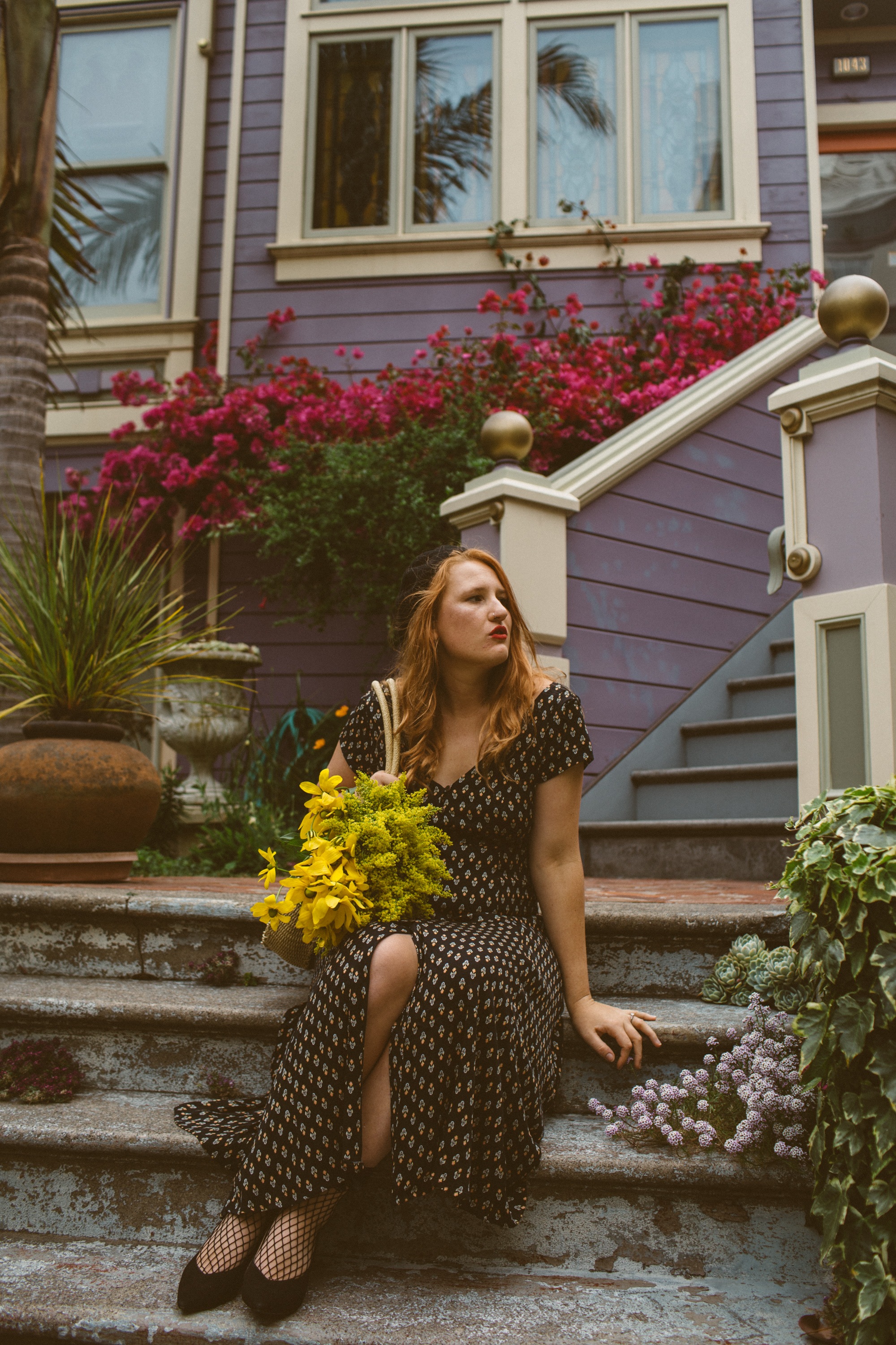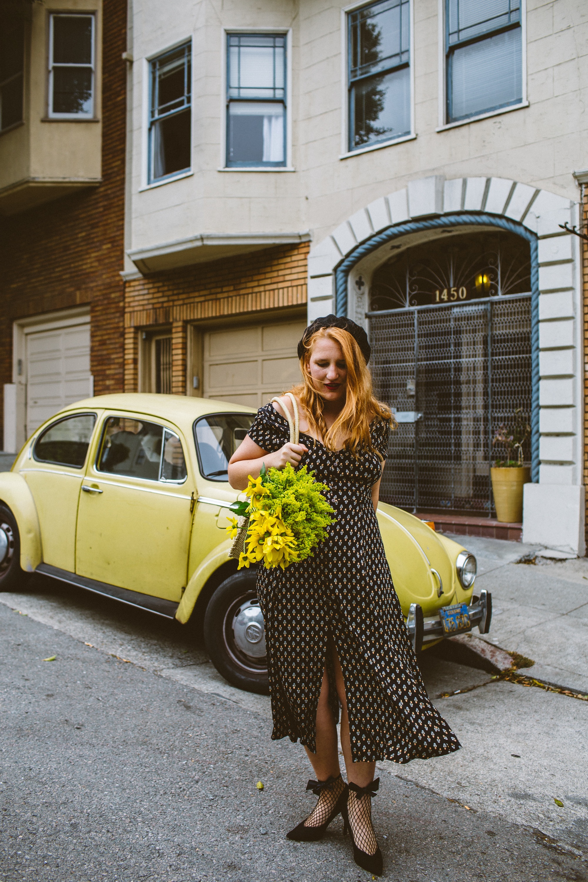 This floral midi dress from Urban Outfitters is incredibly soft, which surprised me. I love the pattern, which leans towards fall color schemes, still works for all seasons. Here, I paired the dress with my favorite fish net socks and heels for a feminine touch. I’ve been obsessed with straw purses lately. This bag is also from Urban Outfitters and would make such a great vacation or farmers market purse as it’s big enough to tuck chunky items in it. Topped it off with a beret for a little French flair!