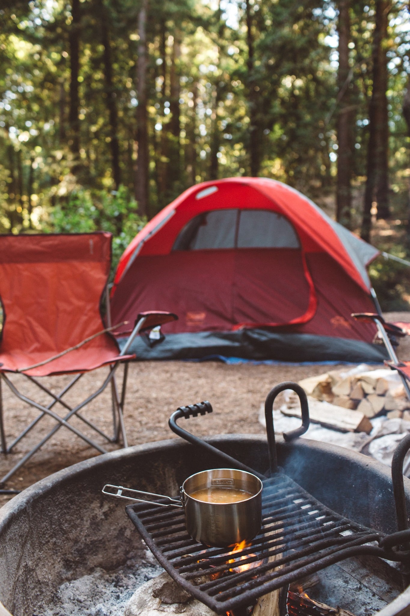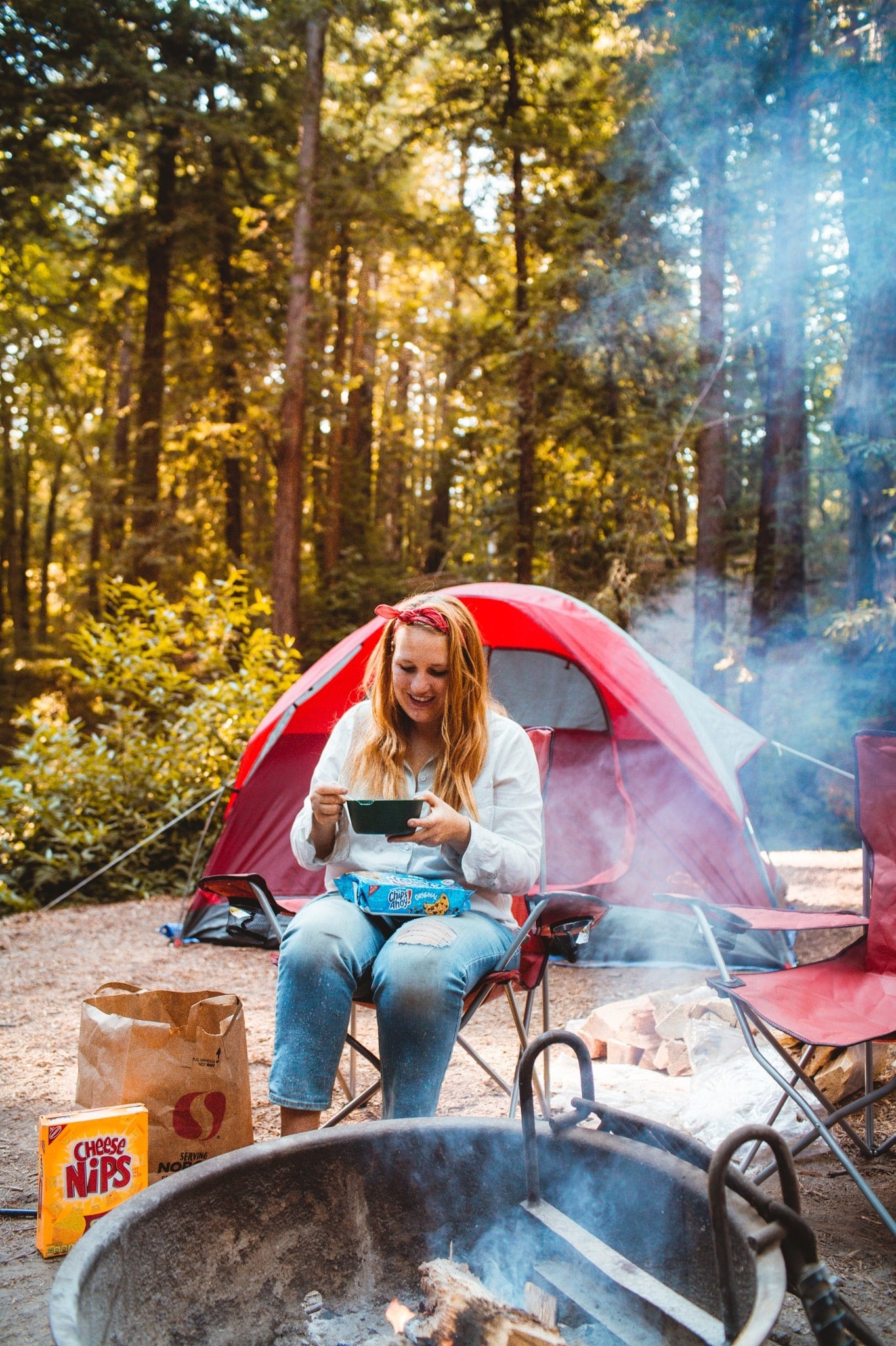 The right food: canned soup, instant coffee, pasta, wine and beer, beans, etc. Things that can be easily cooked on a fire or need no cooking at all. Plus, wine and beer make every camping trip 100% better!