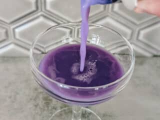 - Combine gin, crème de violette, lemon juice, ube extract, and egg white in a dry cocktail shaker (no ice).