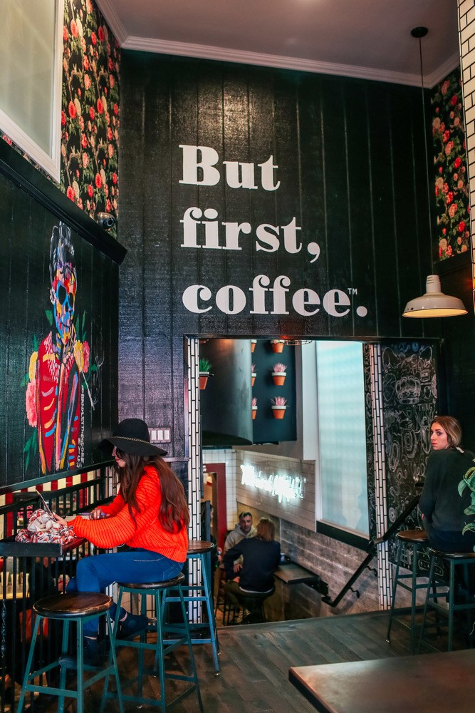 But First, Coffee. That Pink Wall. Rainbow murals.