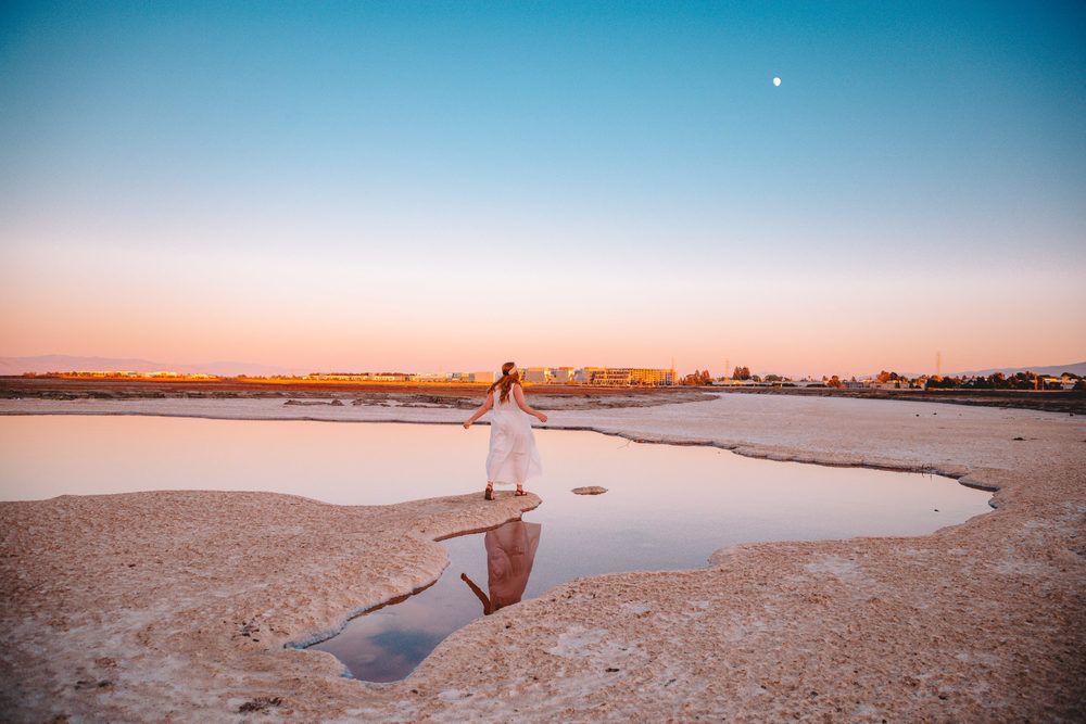 I recommend wearing a white dress if you are shooting in the soft golden hour so you pop against the colorful pools and reflections. If you are visiting in the daytime, though, the hard salt ground is going to be shining bright white. I’d wear a colorful dress or even a black dress so you pop better against the harsh daylight.