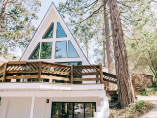 A cool place to stay in Yosemite is this cabin on Bass Lake. Look how pretty it is! I low-key want to move in here forever. This house has a fully equipped kitchen, wrap-around porch, huge living room with tall windows and tons of little details to make the experience feel magical. It's a 4 bedroom home and can fit up to 8 people, making it the perfect Yosemite house to rent if you have a large group or family!