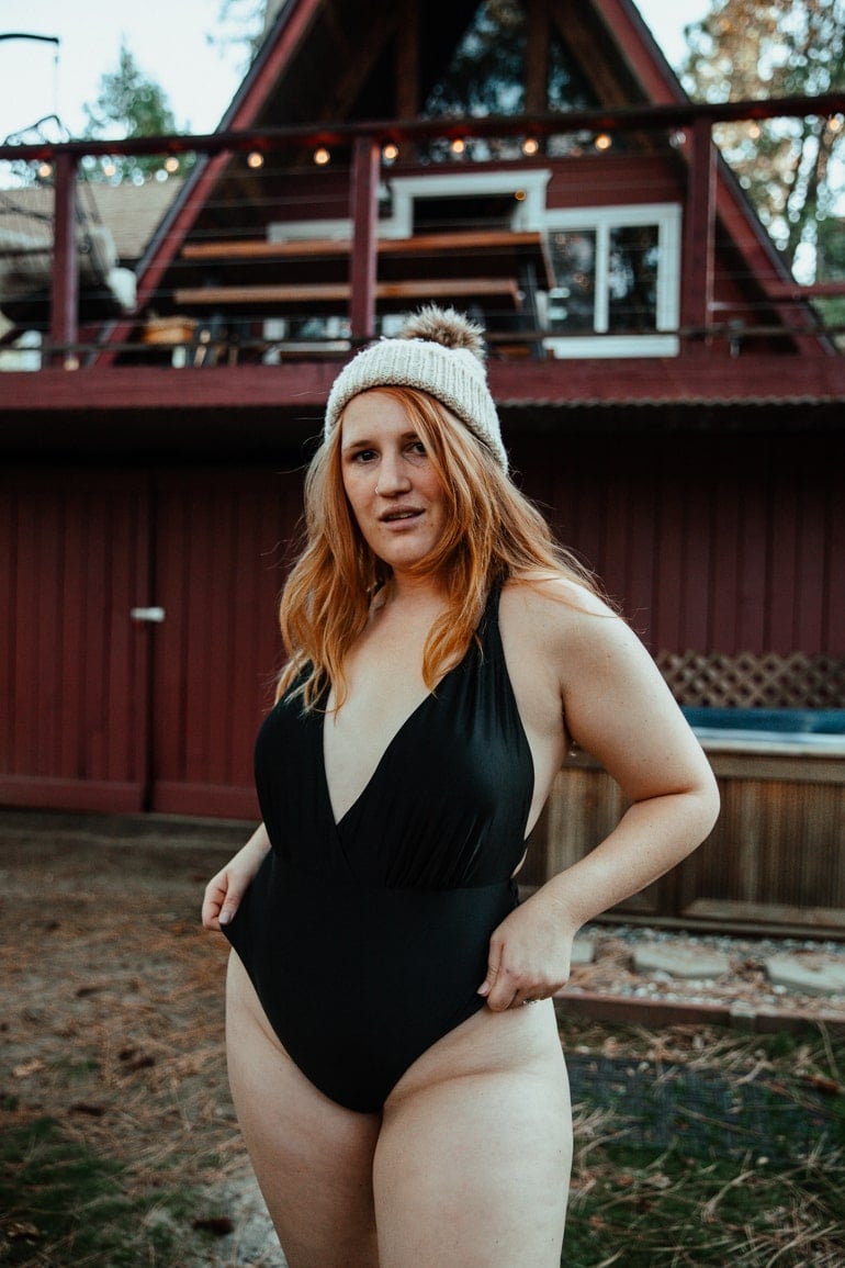 My go-to winter cabin swimsuits are either red or blue, since they pop out again the snow around hot tubs so dang well and make really cute photos. But I always toss in green and/or black one well for options.