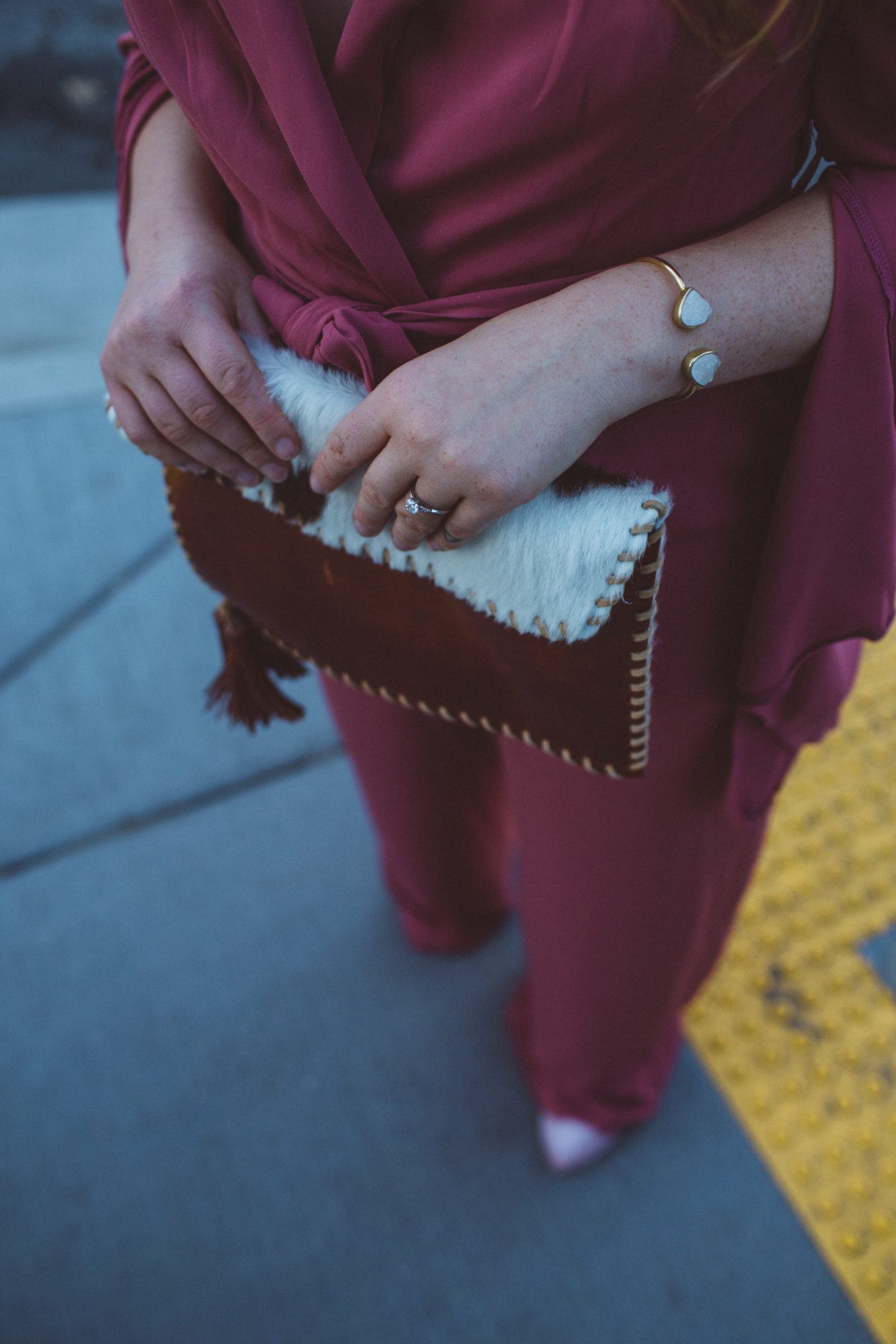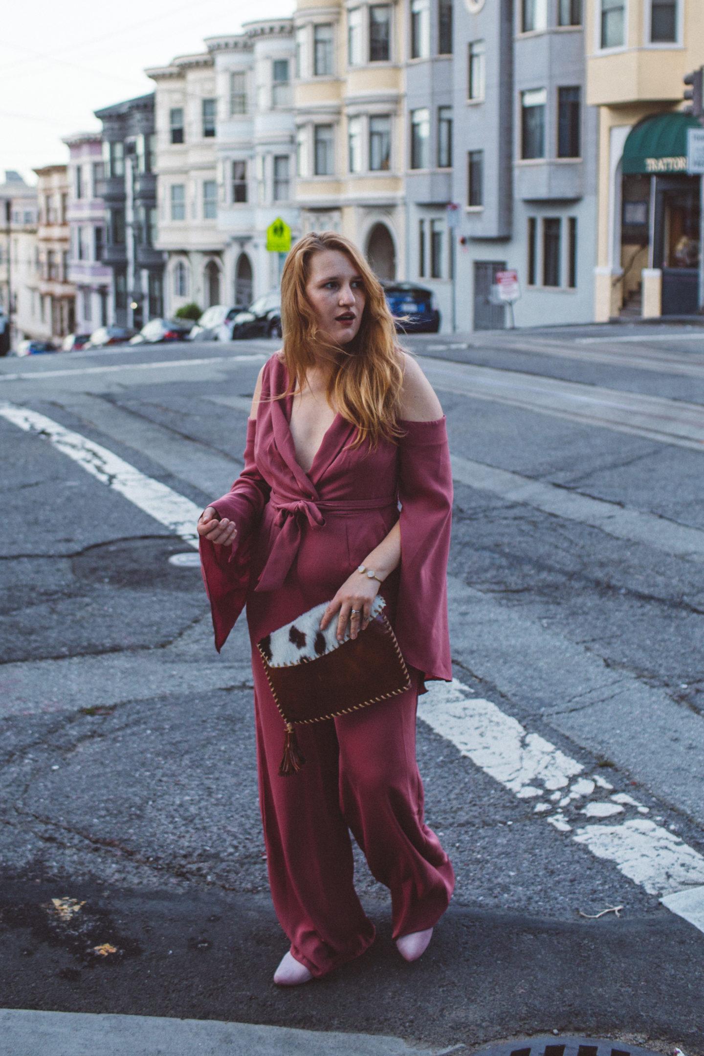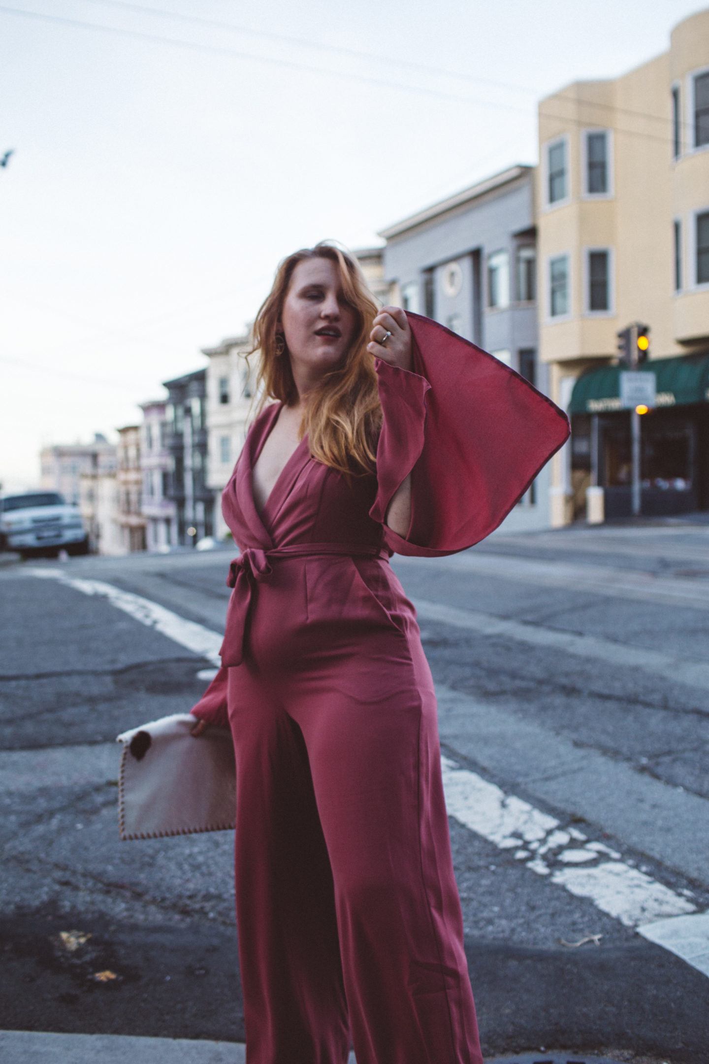 Evening jumpsuits like this one are really easy to style and dress up with the right accessories. Here, I wore pink boots with gold heels for a bit of glam, unique gold face earrings and leather clutch from Gale & Hayes. As you can see, this jumpsuit is a bit long on my 5’5″ frame, so I suggest plan on wearing heels or tailoring it if you are on the shorter side. If you are 5’8″+ then it’ll fit perfectly!