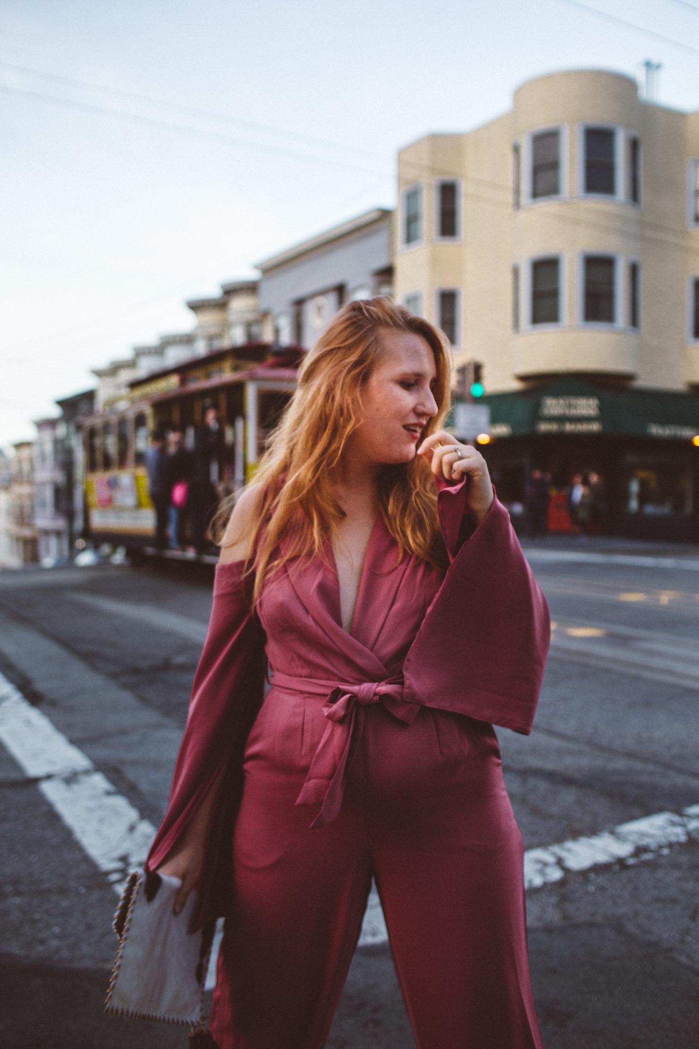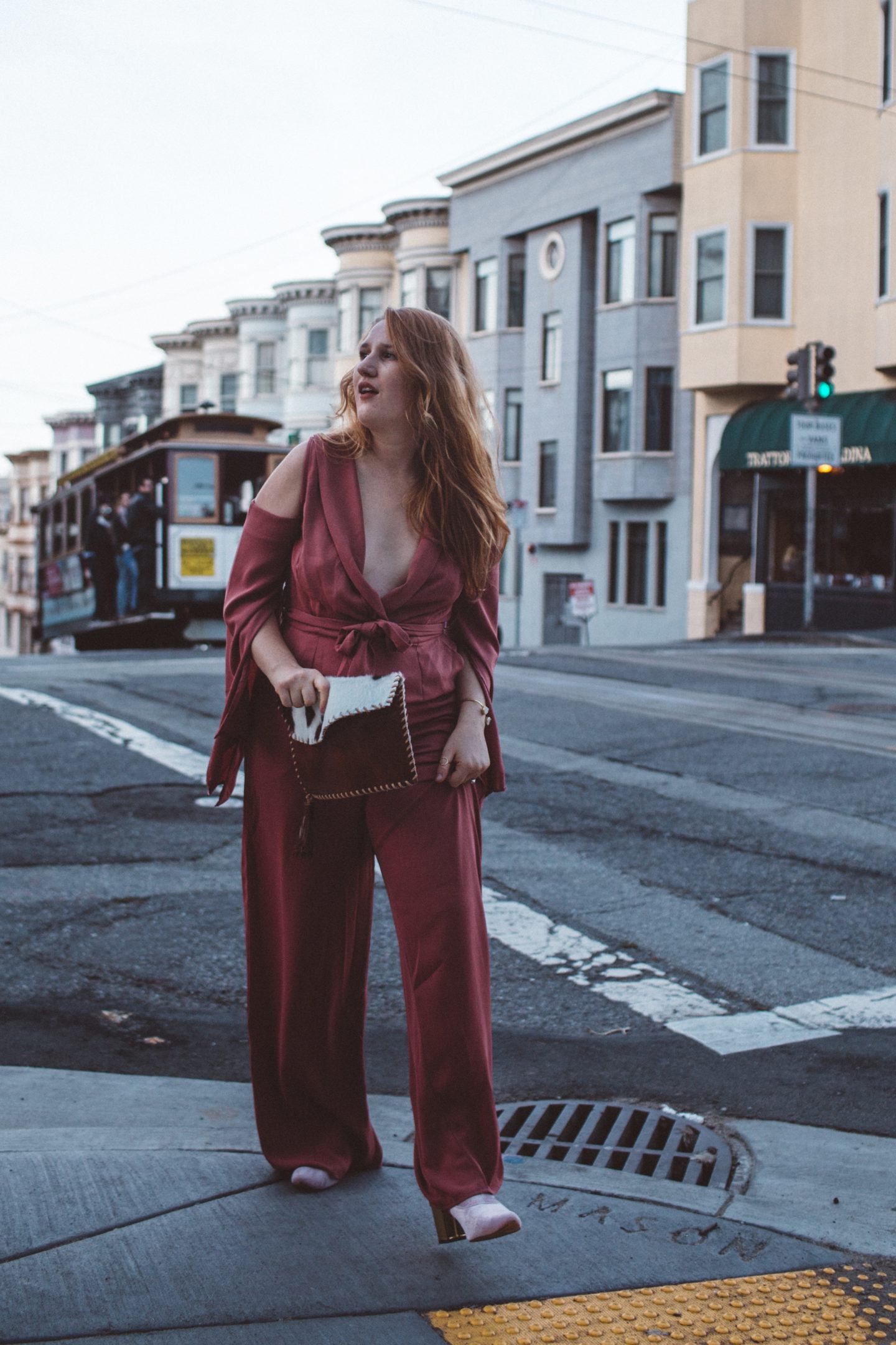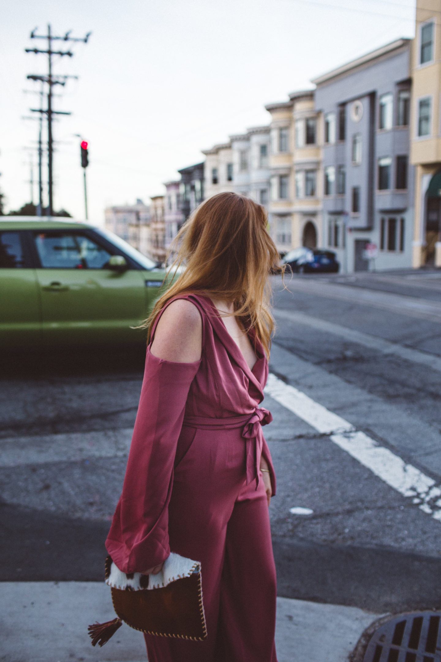 Evening jumpsuits like this one are really easy to style and dress up with the right accessories. Here, I wore pink boots with gold heels for a bit of glam, unique gold face earrings and leather clutch from Gale & Hayes. As you can see, this jumpsuit is a bit long on my 5’5″ frame, so I suggest plan on wearing heels or tailoring it if you are on the shorter side. If you are 5’8″+ then it’ll fit perfectly!