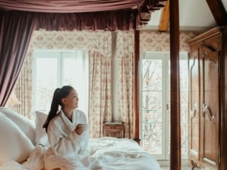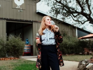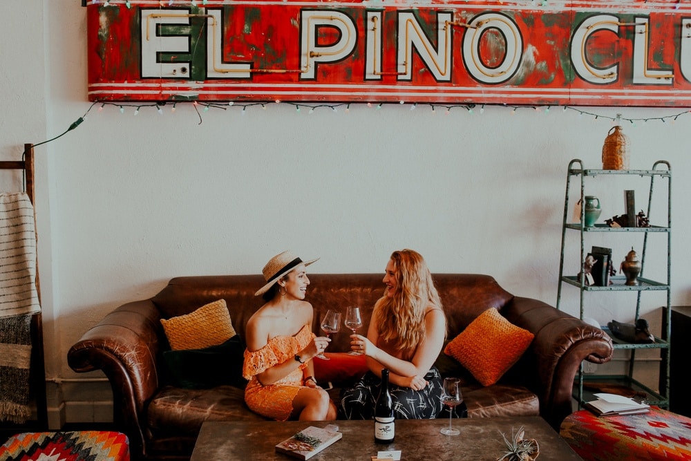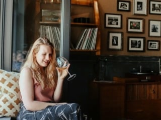 You’re fully in the vineyard now with big windows, a fireplace, records playing. It feels cool without trying too hard. Very millennial but grown up.